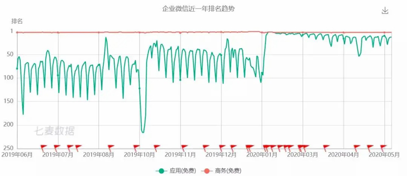 根據(jù)七麥數(shù)據(jù)的排名,我們看到企業(yè)微信在AppStore的排名從疫情之前的100名左右迅速上升到第1名、第2名,并且維持這個(gè)排名長(zhǎng)達(dá)幾個(gè)月;