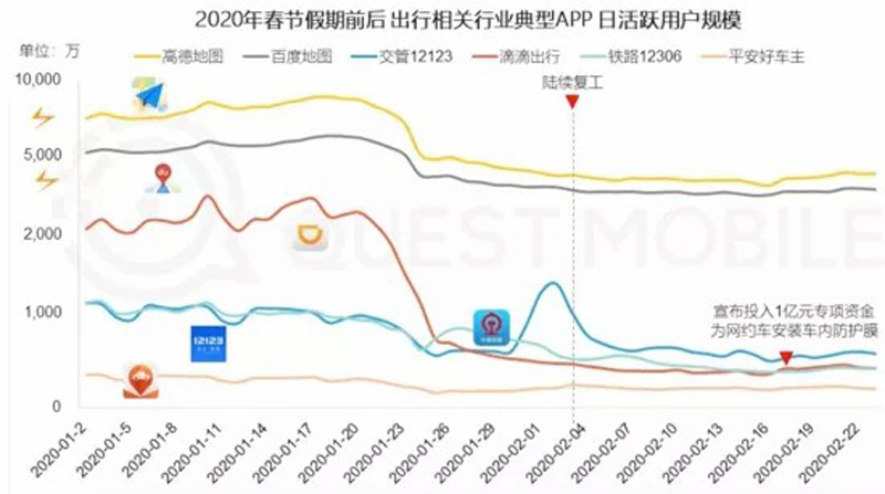 根據(jù)Questmobile數(shù)據(jù),滴滴日活用戶從疫情之前的超2000萬(wàn)下降到不足500萬(wàn)——同樣下降的還有高德、百度等地圖應(yīng)用。