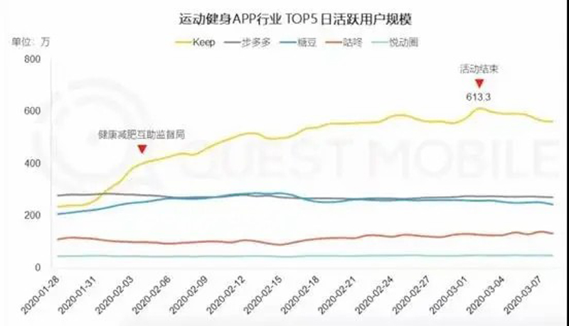 而根據(jù)Questmobile的數(shù)據(jù),Keep的日活從200多萬(wàn)增長(zhǎng)到了最高613.3萬(wàn),增速極其明顯——這和它主打室內(nèi)運(yùn)動(dòng)的特點(diǎn)有直接關(guān)系,咕咚等以室外跑步的APP就沒(méi)有那么幸運(yùn)了。